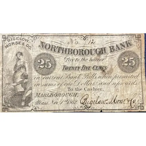 | Obverse lettering | FERD. MAYER & CO. LITHOG 96 FULTON ST. NEW YORK No. *serial number* NORTHBOROUGH BANK Pay to the bearer TWENTY FIVE CENTS in current Bank Bills when presented in sums of one Dollar and upwards To the Cashier MARLBOROUGH, Mass. Nov 1st, 1862 Bigelow, Morse, & Co |