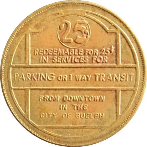 | Opschrift voorzijde | 25 REDEEMABLE FOR 25¢ IN SERVICES FOR PARKING OR 1 WAY TRANSIT FROM DOWNTOWN IN THE CITY OF GUELPH |