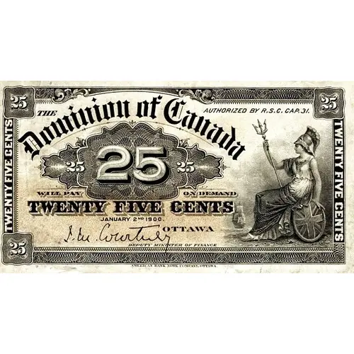 25 AUTHORIZED BY R.S.C. CAP.31. THE DOMININION OF CANADA WILL PAY ON DEMAND TWENTY FIVE CENTS JANUARY 2ND 1900 OTTAWA DEPUTY MINISTER OF FINANCE AMERICAN BANK NOTE COMPANY, OTTAWA. |