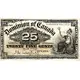 A black and white frame with decorative shapes including the value of the banknote: `25` & `TWENTY FIVE CENTS`. On the left, the inscription `The Dominion of Canada` accompanied by the value of the note `25` & `TWENTY FIVE CENTS` as well as the date and signature. On the right, an allegory of a seated Britannia holding a shield and a trident with a sailing ship in the background. At the bottom, the printer of the banknote. |