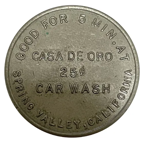 | Obverse lettering | GOOD FOR 5 MIN. AT CASA DE ORO 25¢ CAR WASH SPRING VALLEY, CALIFORNIA |