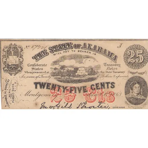 | Obverse lettering | THE STATE OF ALABAMA 25 WILL PAY TO BEARER IN Confederate States Treasury Notes When presented at the State Treasury In sums of Twenty Dollars & upwards TWENTY-FIVE CENTS Montgomery, Jan.ʸ 1ˢᵗ 1863 25 Cts J.T. PATERSON & Co, AUGUSTA Ga. |