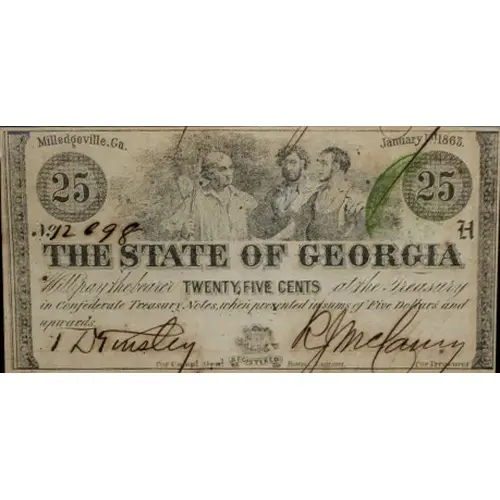 | Obverse lettering | Milledgeville. Ga. January 1st, 1863 25 THE STATE OF GEORGIA Will pay the bearer TWENTY FIVE CENTS at the Treasury in Confederate Treasury Notes when presented in sums of Five Dollars and upwards. |