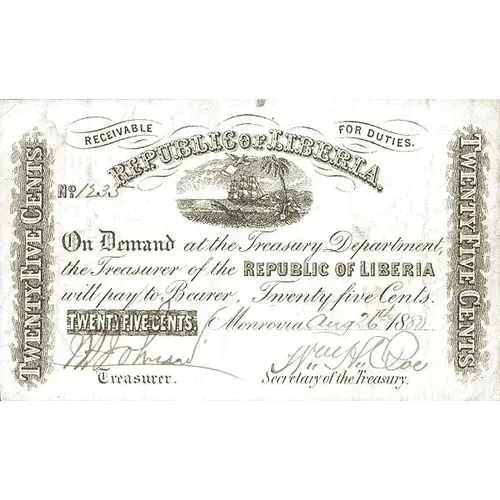| Opis líce | REPUBLIC OF LIBERIA RECEIVABLE FOR DUTIES ON DEMAND AT THE TREASURY DEPARTMENT THE TREASURER OF THE REPUBLIC OF LIBERIA WILL PAY TO BEARER TWENTY-FIVE CENTS TWENTY-FIVE CENTS |