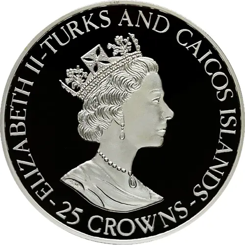 | Obverse lettering | ELIZABETH II-TURKS AND CAICOS ISLANDS RDM -25 CROWNS- |