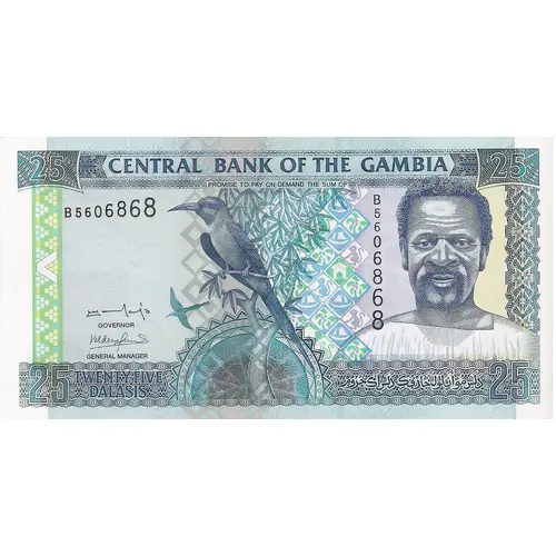 | Obverse lettering | Central Bank of the Gambia Promise to pay on demand the sum of Twenty Five Dalasis |