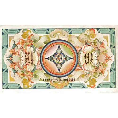 ᠮᠣᠩᠭᠣᠯ ᠤᠯᠤᠰ ᠤᠨ ᠬᠦ ᠶᠢᠨ ᠮᠥᠩᠭᠥᠨ ᠦ ᠲᠡᠮᠳᠡᠭᠲᠦ ᠴᠠᠭᠠᠰᠤ᠂ ᠒᠕ ᠲᠥᠭᠥᠷᠢᠭ᠂ ᠗ ᠨᠢᠭᠡᠪᠦᠷᠢ ᠴᠢᠨ᠂ ᠮᠣᠩᠭᠣᠯ ᠤᠨ ᠠᠷᠪᠠᠨ ᠨᠢᠭᠡᠳᠦᠭᠡᠷᠣᠨ ᠳᠤ ᠬᠡᠪᠯᠡᠨ ᠭᠠᠷᠭᠠᠪᠠᠢ᠂ ᠤᠯᠤᠰ ᠤᠨ ᠬᠦ ᠶᠢᠨ ᠪᠡᠯᠡᠨ ᠮᠥᠩᠭᠥ ᠪᠡᠷ ᠪᠠᠲᠤᠯᠠᠪᠠᠢ᠂ 25 DOLLARS ᠰᠠᠩ ᠤᠨ ᠶᠠᠮᠤᠨ ᠤ ᠲᠡᠷᠢᠭᠦᠨ ᠰᠠᠶᠢᠳ ᠳᠠᠨᠽᠠᠨ᠂ ᠬᠦᠦ ᠶᠢᠨ ᠨᠢᠷᠪᠠ ᠳᠠᠪᠠᠭᠠ᠂ 25 DOLLARS (Translation: Mongolian State Treasury Paper Banknote, Printed in the 11th year of Mongolia, Approved as State Treasury currency, 25 Tögrög, each 7 mace, Minister of Finance Dangzan, Treasury Keeper Davaa.) |