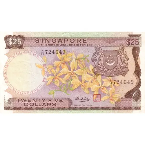 SINGAPORE THIS NOTE IS LEGAL TENDER FOR $25 SINGAPURA 新加坡 சிங்கப்பூர் SINGAPORE TWENTY FIVE DOLLARS MINISTER FOR FINANCE (Translation: Singapore in the 4 Official Languages, Malay, Chinese, Tamil and English) |