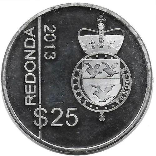 Artistry: Lacking specific documentation of an individual engraver, the design of the 2013 Redondan 25 Dollars likely emerged from a private mint's design studio, adhering to a contemporary commemorative stylistic school. Typically, such issues feature a stylized effigy representing the current claimant or the arms of Redonda. The reverse usually presents emblematic imagery pertinent to the island's natural beauty, maritime heritage, or its unique literary associations, executed with a blend of modern relief and traditional elements.