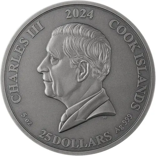 | Obverse lettering | CHARLES III 2024 COOK ISLANDS DT 5 oz 25 DOLLARS Ag 999 |