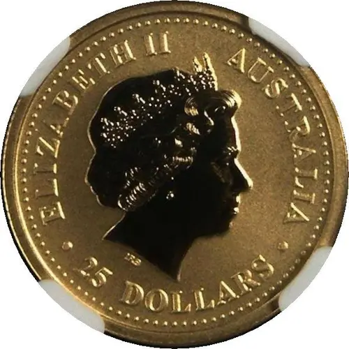 | Reverse lettering | THE AUSTRALIAN NUGGET 1/4 OZ. 9999 GOLD 2002 |