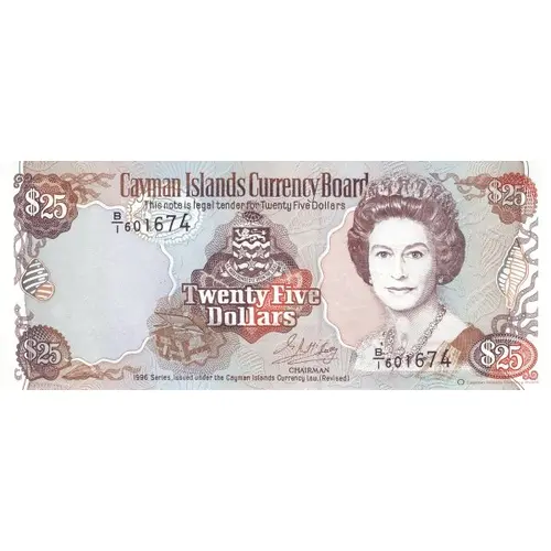 $25 Cayman Islands Currency Board $25 This note is legal tender for Twenty Five Dollars HE HATH FOUNDED IT UPON THE SEAS Twenty Five Dollars 1991 Series, Issued under the Cayman Islands Currency Law (Revised) Cayman Islands Currency Board |