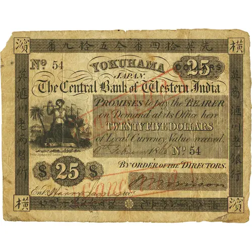 | Obverse lettering | 濱 番九拾五今番四拾英先 横 № 54 YOKUHAMA 25 DOLLARS 英 Japan 英 進 The Central Bank of Western India 商 川 PROMISES to pay the BEARER 進 老 on Demand at its Office here 川 西 TWENTY FIVE DOLLARS 老 替 of Local Currency. Value received. 銀 所 9th February 1866 № 54 行 Batho, Sprague & Co. London $ 25 $ BY ORDER OF THE DIRECTORS. Ent. ACCT. 横 右現◯銀◯拾五牧 元五拾◯洋◯支不西 濱 |