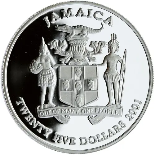 | 表面の銘文 | JAMAICA TWENTY FIVE DOLLARS 2001 OUT OF MANY, ONE PEOPLE |