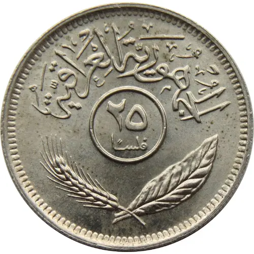 | Obverse lettering | الجمهورية العراقية ٢٥ فلساً (Translation: The Iraqi Republic 25 Fils) |