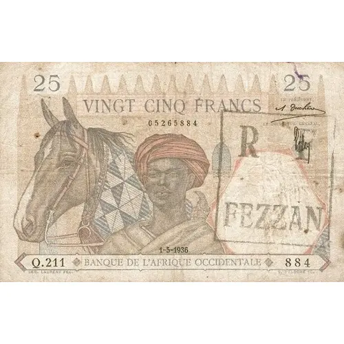 Vingt Cinq Francs RF Fezzan Banque de l`Afrique Occidentale SEB. LAURENT FEC. E. DELOCHE SC. (Translation: Twenty-Five Francs Bank of West Africa) |
