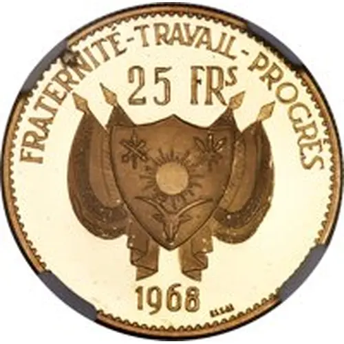 | Obverse lettering | FRATERNITÉ-TRAVAIL-PROGRÈS 25 FRs 1968 ESSAI (Translation: Brotherhood, work, progress. Trial.) |