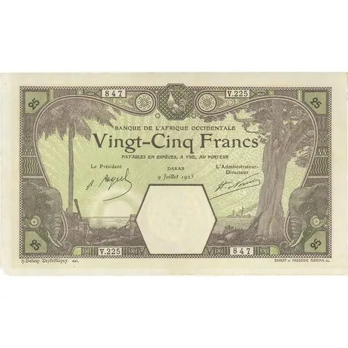 | Légende de l’avers | BANQUE DE L`AFRIQUE OCCIDENTALE VINGT-CINQ FRANCS PAYABLES EN ESPÈCES, A VUE, AU PORTEUR DAKAR h.Bellery Desfontaines del. ERNEST ET FREDERIC FLORIAN SC. |