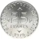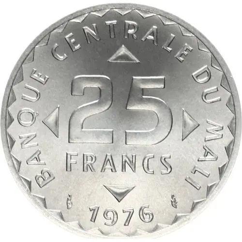 | Averslegende | BANQUE CENTRALE DU MALI ▲ ◀ 25 ▶ ▼ FRANCS 1976 (Translation: Central Bank of Mali) |