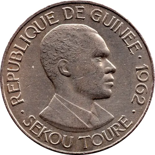 Historical Context: The 1962 25 Francs Guinéens coin symbolizes Guinea's pivotal post-independence era, following its 1958 declaration of sovereignty from France under President Ahmed Sékou Touré. This period established the First Republic and introduced the Franc Guinéen, replacing the CFA franc. This coinage series represented a tangible assertion of national sovereignty, a clear break from colonial economic structures, reflecting Touré's socialist policies and pan-Africanist vision.