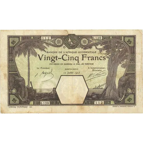 | Obverse lettering | BANQUE DE L`AFRIQUE OCCIDENTALE VINGT-CINQ FRANCS PAYABLES EN ESPÈCES, A VUE, AU PORTEUR PORTO-NOVO h.Bellery Desfontaines del. ERNEST ET FREDERIC FLORIAN SC. |