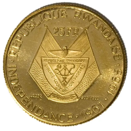 · REPUBLIQUE RWANDAISE · 25 FR INDEPENDANCE · 1961-1965 LIBERTÉ - COOPERATION - PROGRÈS ARGOR 900/1000 (Translation: Republic of Rwanda. Independence. Freedom - Cooperation - Progress.) |