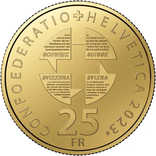 CONFOEDERATIO HELVETICA 2023 B 25 FR Bund und Kantone födern die Verständigung und den Austausch zwischen den Sprachgemeinschaften. SCHWEIZ La Confédération soutient les cantons plurilingues dans l`exécution de leurs taches particulières. SUISSE SVIZZERA La Confederazione sostiene i provvedimenti dei Cantoni dei Grigioni e del Ticino voiti a conservare a promuovre le lingue romancia e Italiana. SVIZRA La Confederaziun sustegna mesiras dais chantuns Grischun e Tessin per mantegnair e promover la lingua rumantscha e tallana. |