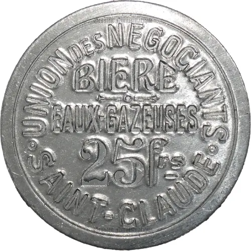 | Obverse lettering | Union des Négociants Bière et Eaux gazeuses 25 Frs Saint-Claude |