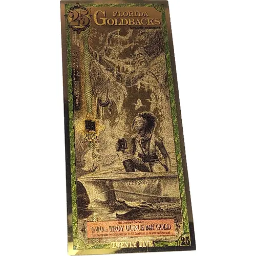 | Obverse lettering | 25 FLORIDA GOLDBACK Specie Legal Tender Instrument US Patent 10781520. Privately Issued. Not US Dollar Legal Tender AURUM Goldback.com This Goldback Contains 1/40th TROY OUNCE 24K GOLD Exchangeable by Goldback Inc. in U.S. Gold Coin to Bearer on Demand TWENTY FIVE 25 |