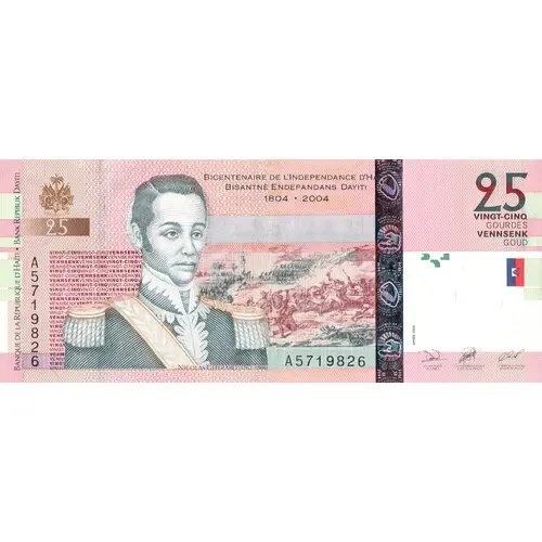 | توضیحات روی اسکناس | Nicolas Geffrard (1762-1806), Battle scene, National Coat of Arms and National flag of Haiti |