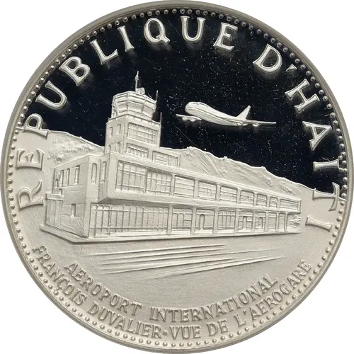 | Obverse lettering | REPUBLIQUE D`HAITI AEROPORT INTERNATIONAL FRANÇOIS DUVALIER. VUE DE L`AEROGARE (Translation: Republic of Haiti François Duvalier International Airport View of an airplane) |