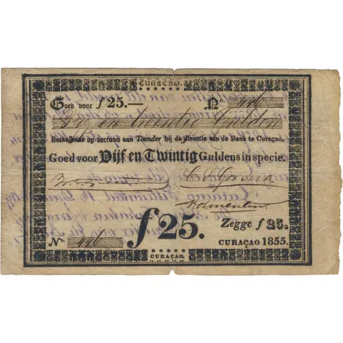 | Obverse lettering | CURAÇAO Goed voor f. 25,- Vijf en Twintig Gulden Betaalbaar op vertoon aan Toonder bij de directie van de BANK te Curaçao. Goed voor Vijf en Twintig Gulden in specie. f.25,- Zegge f 25. Curaçao, 1855 (Translation: Curaçao Good for f. 25,- Twenty Five Gulden ayable on presentation to Bearer at the management of the Bank in Curaçao. Good for Twenty Five Gulden in specie. Curaçao, 1855) |