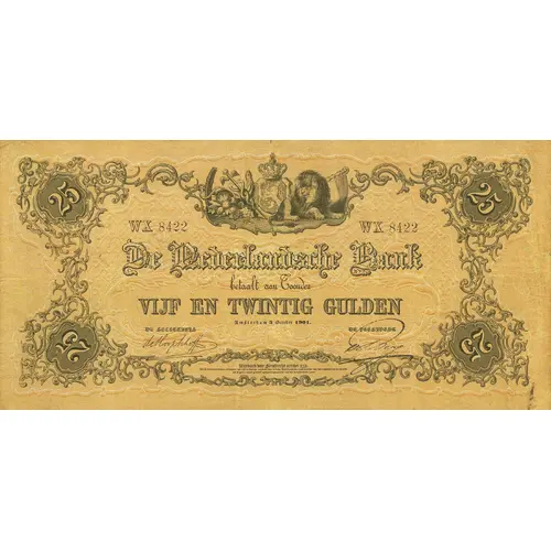 25 De Nederlandsche Bank betaalt aan toonder VIJF EN TWINTIG GULDEN Amsterdam, 3 October 1901. 25 (Translation: Bank of Netherlands Pay to the Bearer Twenty Five Gulden Amsterdam, October 3, 1901.) |