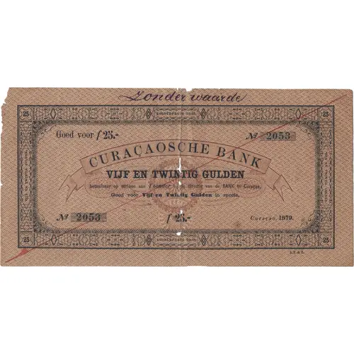(Translation: Good for f. 25,- Curacao Bank Twenty Five Gulden payable on presentation to Bearer at the management of the Bank in Curaçao. Good for Twenty Five Gulden in specie. Curaçao, 1879)