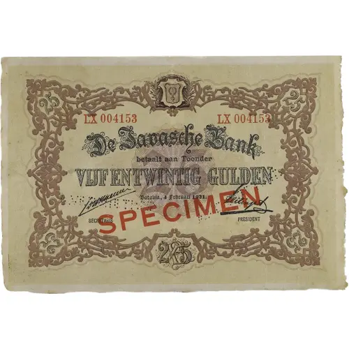 (Translation: The Javanese Bank Pay to the Bearer Twenty Five Gulden Batavia, February 4, 1921. Specimen)