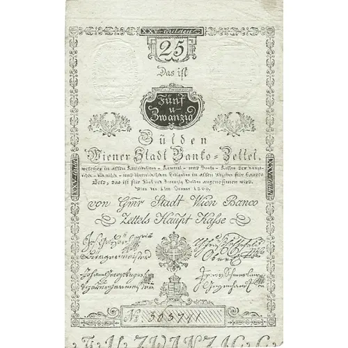 Opis líce XXV Gulden 25 Das iſt Fünf u:Zwanzig G Fünf u- Zwanzig Gulden Wiener Stadt Banko-Zettel