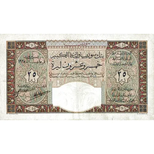 | Reverse lettering | SYRIE BANQUE DE SYRIE ET DU GRAND-LIBAN VINGT CINQ LIVRES REMBOURSABLE AU PORTEUR EN CHEQUE SUR PARIS OU MARSEILLE A RAISON DE VINGT FRANCS PER LIVRE CL. SERVEAU FEC E. DELOCHE SC. |