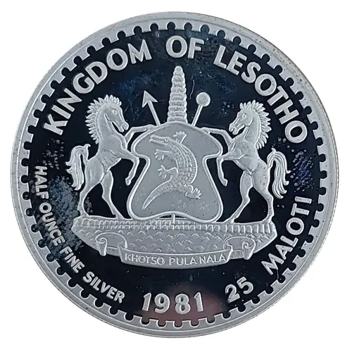 | Obverse lettering | KINGDOM OF LESOTHO HALF OUNCE FINE SILVER 1981 25 MALOTI |