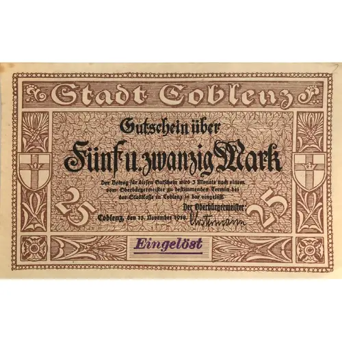 STADT COBLENZ GUTSCHEIN ÜBER FÜNFU.ZWANZIG MARK DER BETRAG FÜR DIESEN GUTSCHEIN WIRD 3 MONATE NACH EINEM VOM OBERBÜRGERMEISTER ZU BESTIMMENDEN TERMIN BEI DER STADTFASSE IN COBLENZ IN BAR EINGELÖST. 25 DER OBERBÜRGERMEISTER: [SIGNATURE] 25 COBLENZ, DEN 15. NOVEMBER 1918 EINGELÖST (Translation: City of Coblenz Coupon for twenty-five Marks The amount for this coupon will be redeemed in cash at the city assessment in Coblenz 3 months after a date to be determined by the mayor. The mayor: Redeemed) |