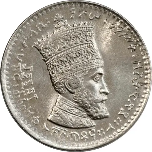| Obverse lettering | ቀዳማዊ፡ኀይለ፡ሥላሴ፡ንጉሠ፡ነገሥት፡ዘኢትዮጵያ። ፲፱፻፳፫ ⥼ ፳፭ መቶኛ:: ⥽ (Translation: Hailé Selassié I, King of Kings (Emperor) of Ethiopia 10 9 100 20 3 (meaning (10+9)*100 +20+3 = 1923) 25 Matona/Metonya (መቶ means hundred, መቶኛ means hundreth)) |