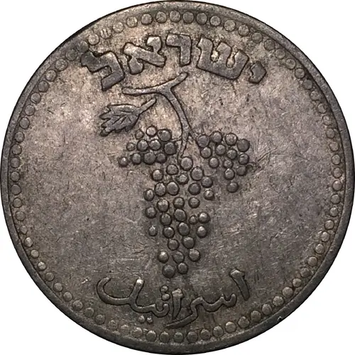 | Obverse description | Cluster of grapes, based off of coins struck during the Bar-Kochba Revolt (132-135 CE); `Israel` in Hebrew above and in Arabic below. |