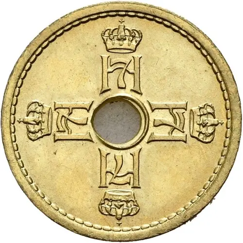 Hole in the centre and a cross that has equal length arms. Each arm is crowned and has the monogram of the king. Beaded ring on the rim. |