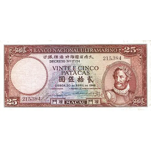| Obverse lettering | BANCO NACIONAL ULTRAMARINO 行銀理滙外海國洋西大 DECRETO-LEI № 17,154 VINTE E CINCO PATACAS 圓伍拾貳 LISBOA, 20 de ABRIL de 1948. O ADMINISTRADOR | O PRESIDENTE DE CONSELHO ADMINISTRAÇÃO |