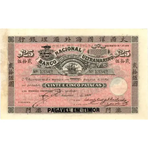 | Obverse description | Bank Note from Macau , counterstamped in 1945: -Printed stamp `PAGAVEL EM TIMOR` |
