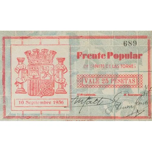 | Obverse lettering | Frente Popular DE CAÑETE DE LAS TORRES VALE 25 PESETAS 10 Septiembre 1936 (Translation: Popular Front of Cañete de las Torres Value Twenty-five Pesetas September 10, 1936) |