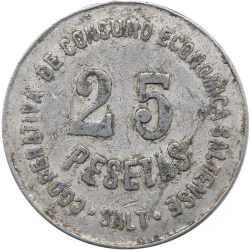 | Obverse lettering | COOPERATIVA DE CONSUMO ECONOMICA SALTENSE 25 PESETAS · SALT · (Translation: Economic Consumer Cooperative `Saltense`) |
