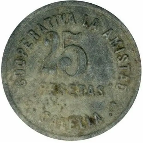 COOPERATIVA `LA AMISTAD ` CALELLA 25 PESETAS (Translation: Cooperative `La Amistad`) |