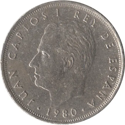 | Obverse lettering | JUAN CARLOS I REY DE ESPAÑA ·1980· (Translation: Juan Carlos I King of Spain) |