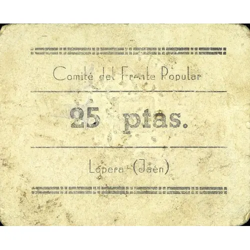 Comité del Frente Popular 25 ptas. Lopera (Jaén) (Translation: Popular Front Committee 25 Pesetas Lopera (Jaén)) |