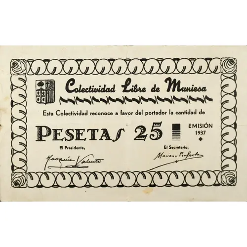 (Translation: Free Collectivity of Muniesa This Collectivity recognizes in favor of the bearer the amount of Pesetas 25 Issue 1937)